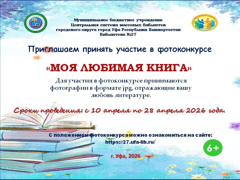 С 10 апреля по 22 мая 2026 года Библиотека № 27 МБУ Централизованной системы массовых библиотек ГО г. Уфа РБ запускает фотоконкурс «Моя любимая книга». Его участником может стать любой желающий без возрастных ограничений.