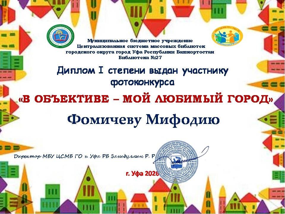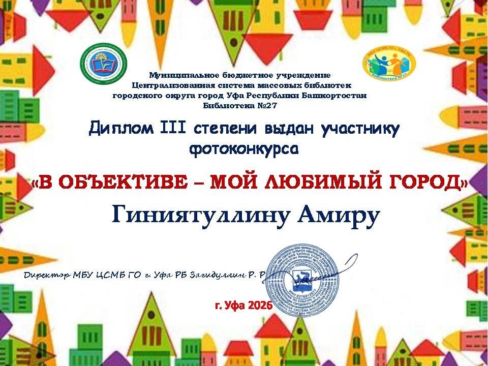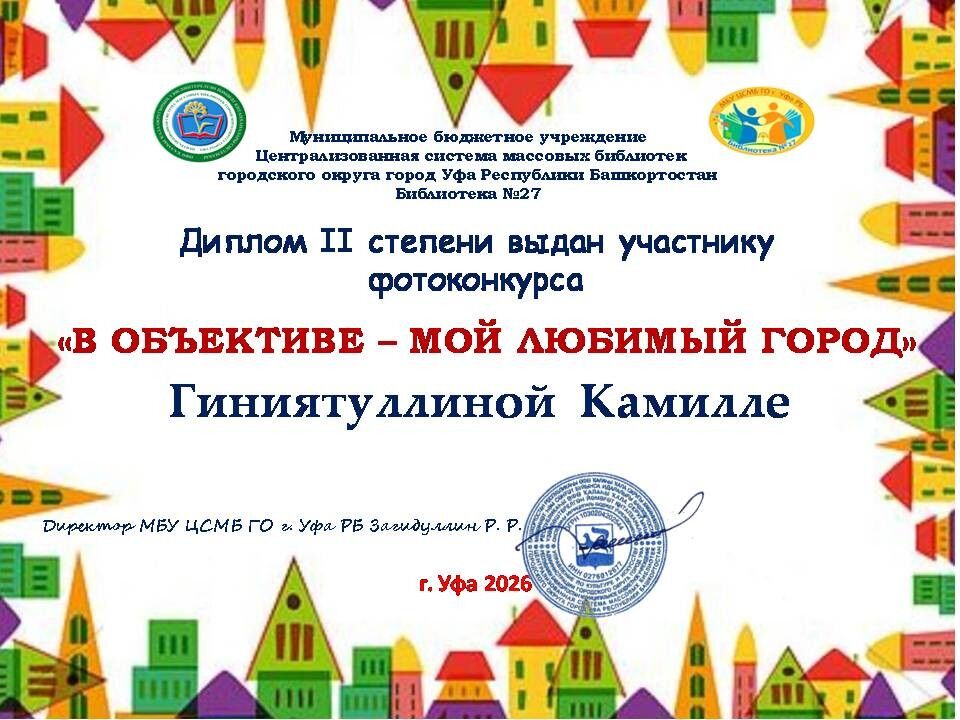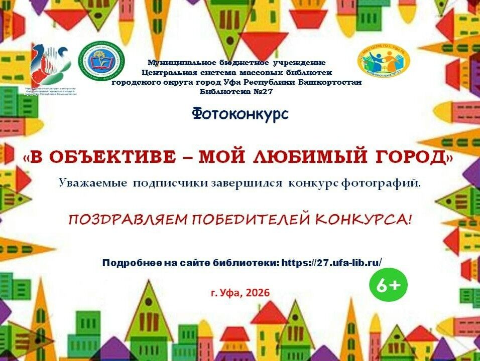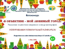 Завершился Фотоконкурс «В объективе мой любимый город», организованный библиотекой №27 МБУ ЦСМБ ГО г. Уфа РБ.По итогам on-line голосования, которое прошло с 10 по 20 марта, были определены победители фотоконкурса.