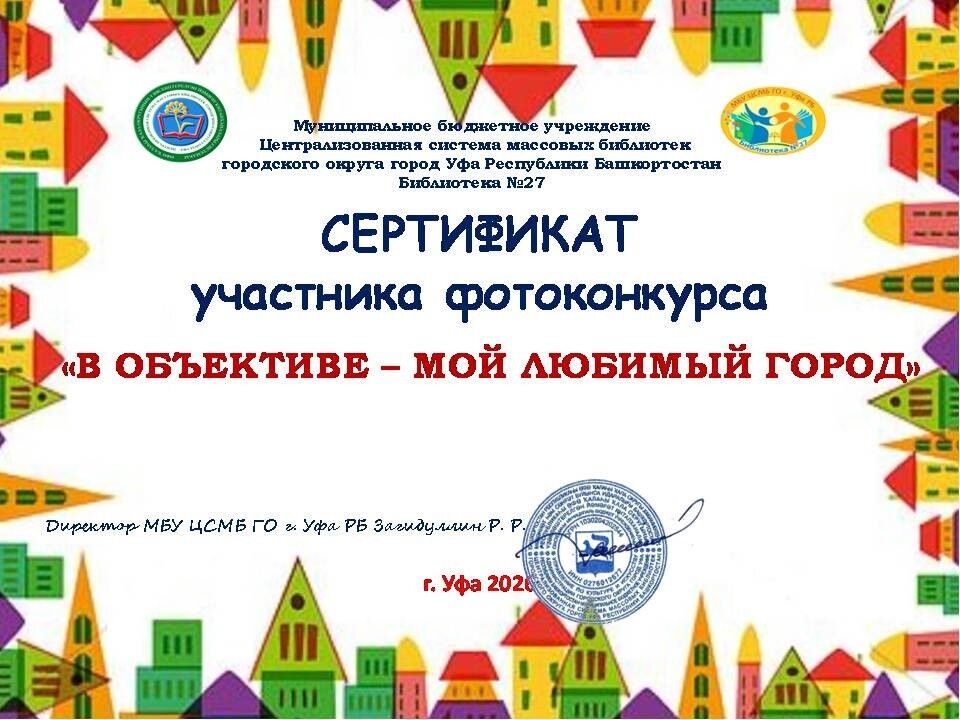 Все участники конкурса будут награждены сертификатами участника, который будет доступен на официальном сайте библиотеки № 27 МБУ ЦСМБ ГО г. Уфа РБ: 27.ufa-lib.ru/ в электронном виде.